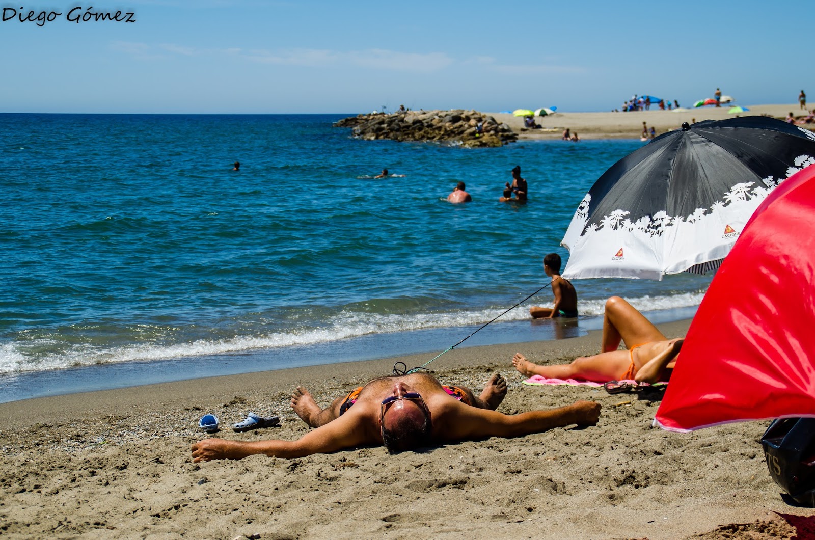 El personaje de la foto ha ido más allá, la pareja le dijo que como la sombrilla se volase ya no volverían a la playa nunca más… y miren donde la ató el «gachón«